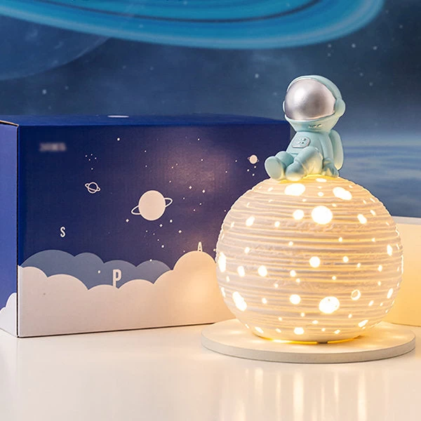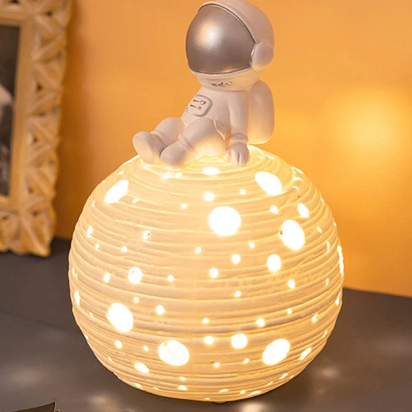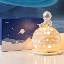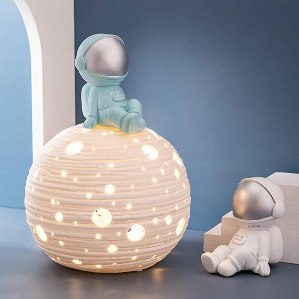 The Ceramic Moon Light features a white or blue colored astronaut sitting on top of the glowing moon. Each of these home decor pieces is crafted with resin and ceramic materials and is plugged in using a USB cord and port.