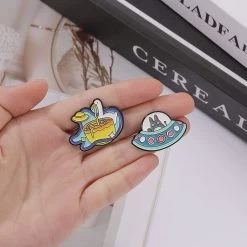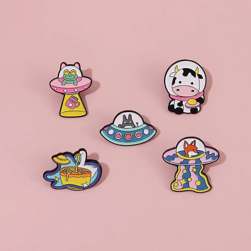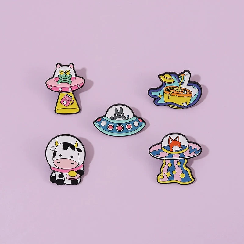 The pins showcases a collection of cute animals including a frog, cow, Totoro-inspired creature, fox, and duck, all taking a ride on a whimsical spaceship. It’s perfect for anyone who loves animals, space, or just wants to inject a bit of lightheartedness into their style.