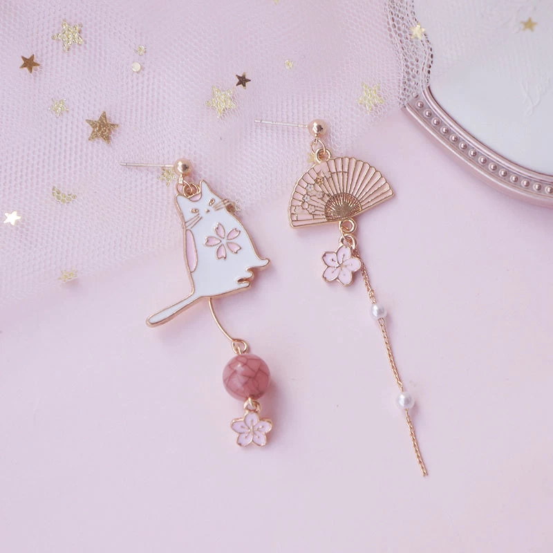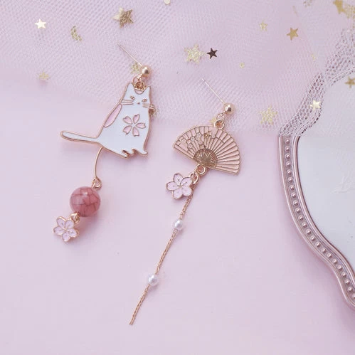 Cute Mismatched Cat And Fan Earrings