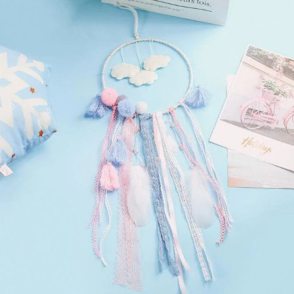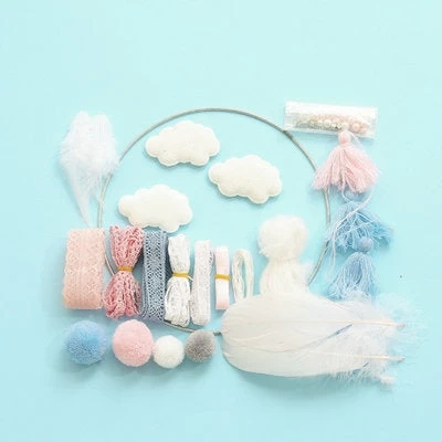 Includes: Ring, fluffy clouds, feathers, pom poms, assorted lace fabric strips and tassels