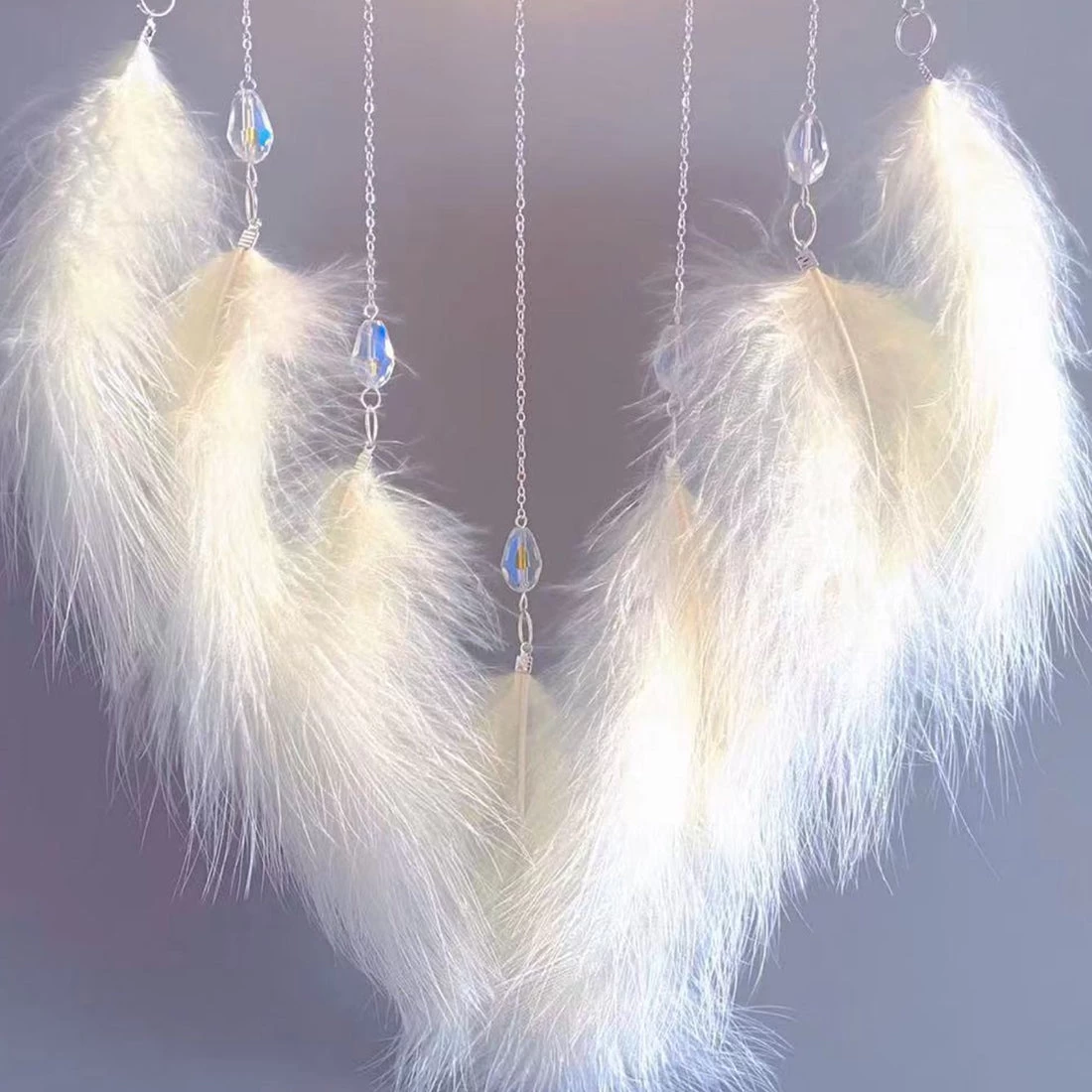 Material: LEDs, feathers, chalcedony, crystal, thread, alloy