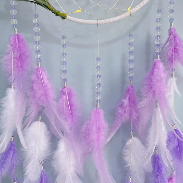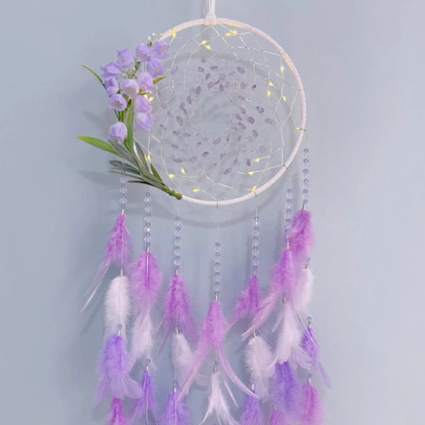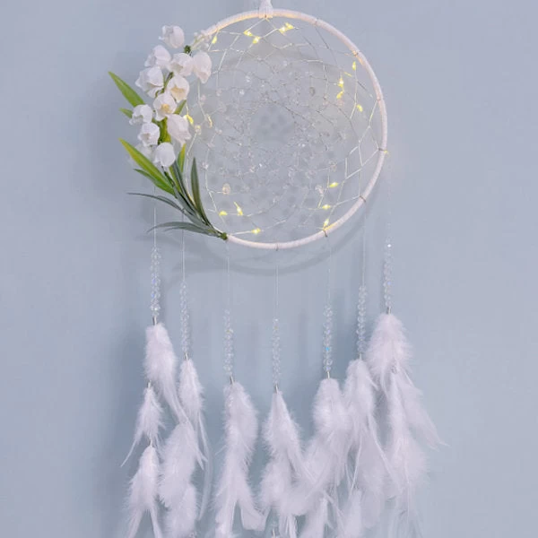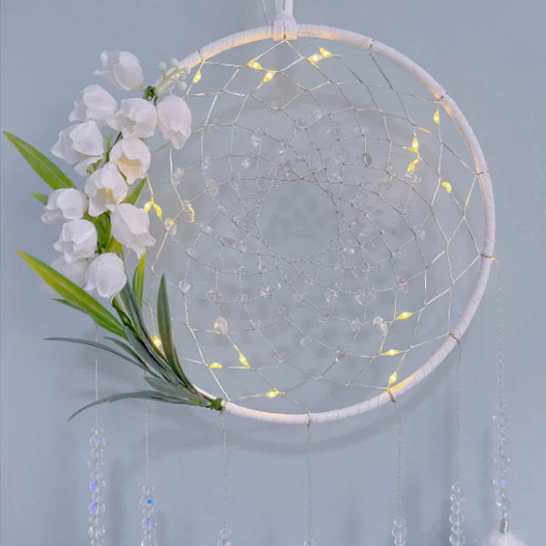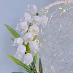A dreamcatcher features a Lily of the Valley design. Dreamcatchers are often used as decorative and symbolic items in many cultures, believed to trap bad dreams and negative energy while allowing good dreams to pass through and reach the dreamer. Adding the Lily of the Valley design makes it a unique and visually appealing decoration.
