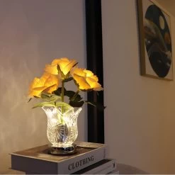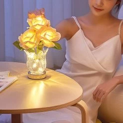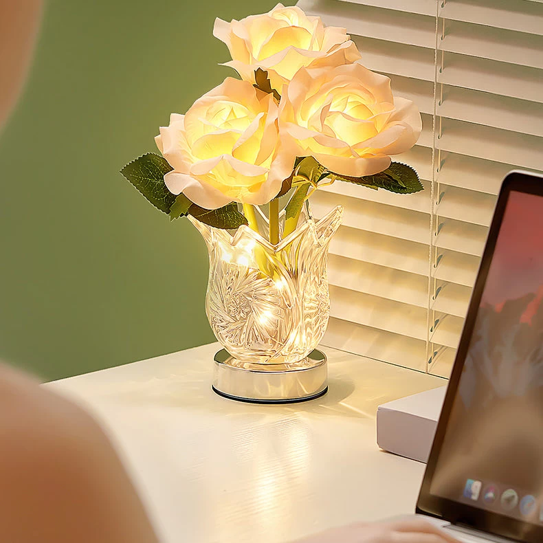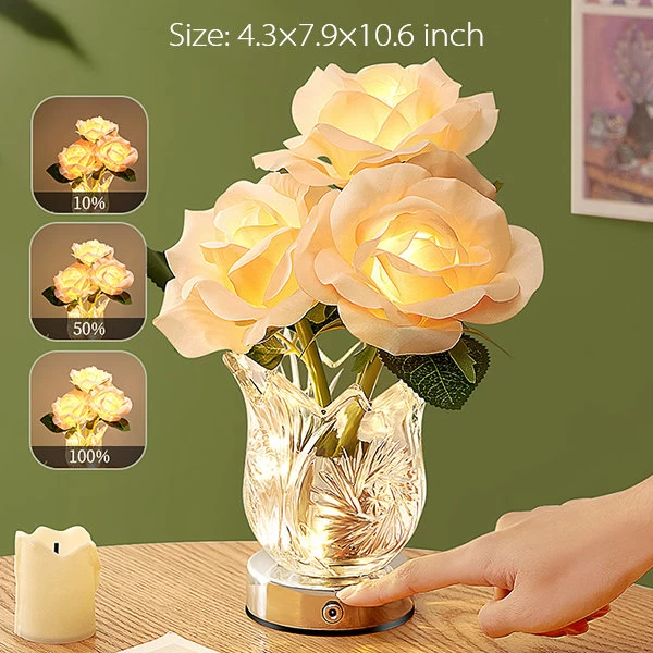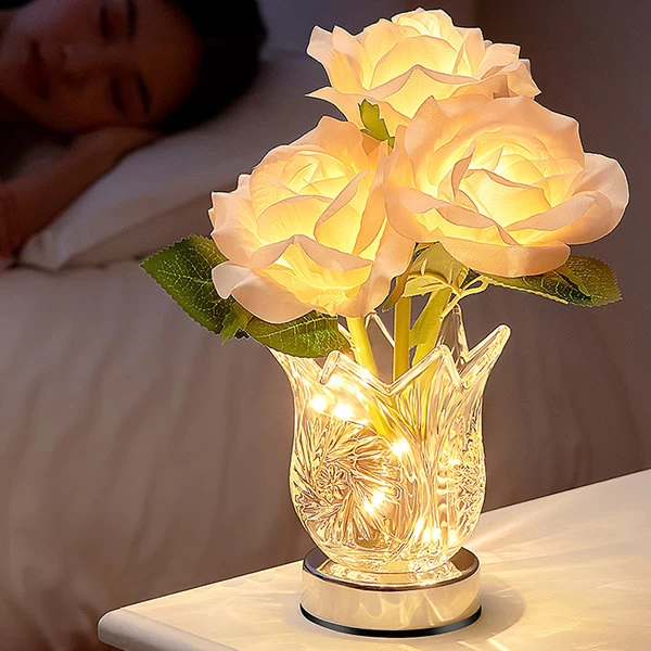 To turn on the lights of the rose lamp, gently tap the charging port located on the vase. The lamp will automatically light up and you can adjust the brightness level by long-pressing the same charging port.